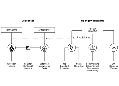 Anders als das Jobcenter, das nachhaltig wirtschaftlich betrieben werden muss, bietet das Dachgewächshaus das Potential ein experimentelleres Energiekonzept zuzulassen. Der innovative Projektansatz besteht unserer Auffassung nach in der Schaffung von Synergien zwischen den teils zuwiderlaufenden Ansätzen.
