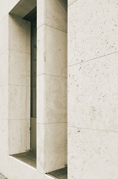 Die Fassade soll ein wertiges, aber unaufdringliches Erscheinungsbild erhalten. Der helle Naturstein hat eine puristische Ausstrahlung und wirkt dennoch edel. Der Travertin soll nach dem Schliff in seiner natürlichen, offenporigen Struktur belassen werden, um den authentischen Charakter zu betonen.